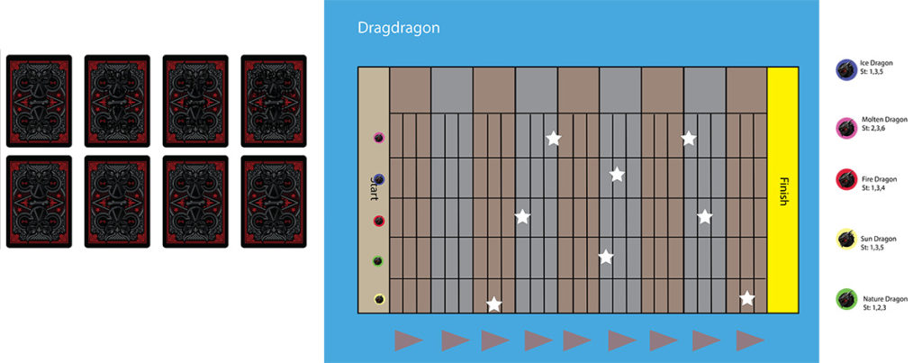DESCRIPTION: The objective of DragDragon is to beat your opponents in the race. The class created the idea and continued to develop the game more and more throughout the semester. The final game will be a tabletop board game, that will be played in the virtual world as well as the physical world. The virtual game will be created within Unreal Engine focusing on player experience.