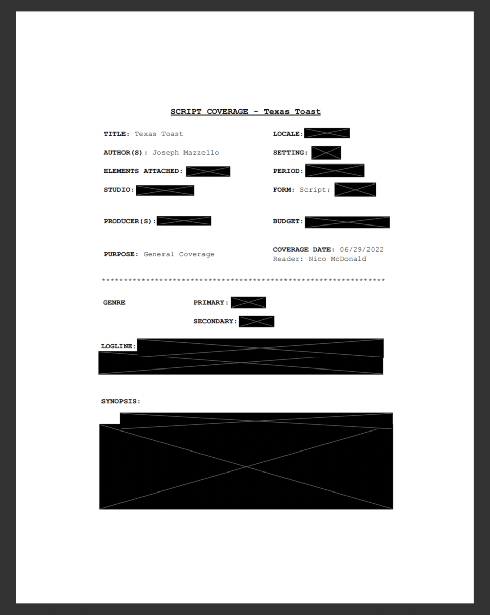 DESCRIPTION: This is title page and first page of coverage I completed for a feature length script. In my coverage, I give a synopsis of the film, rate different aspects such as potential marketability, quality of visual elements and dialogue, as well as my personal thoughts and feedback on the script. This is done for scripts currently looking to be produced, and so I have redacted the majority of the information in compliance with the NDA I have signed with the production company.