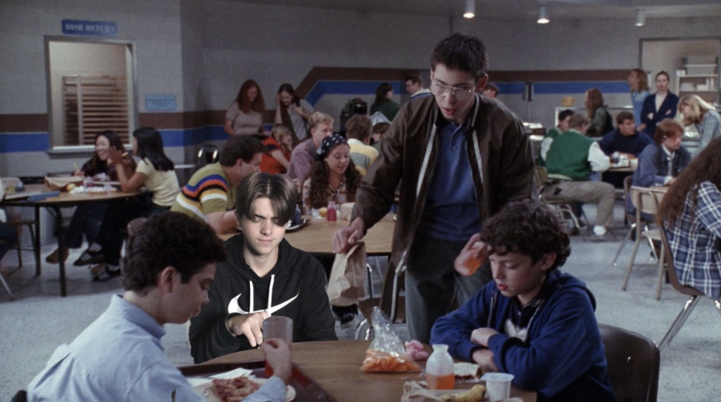 DESCRIPTION: For my somewhere project, I decided to insert myself in the world of “Freaks and Geeks”. This T.V. show from the late 90’s shows the life and struggles of many different high school students during the 80’s. For my edit I took a picture of myself reaching into a bag of chips to act as if I was actually sitting around the table. Next I pasted myself into the scene, one thing I could have done better on was the color correction, I look a little too bright for the rest of the scene. Despite this, overall I think it turned out well and this is one of my favorite styles of creation.