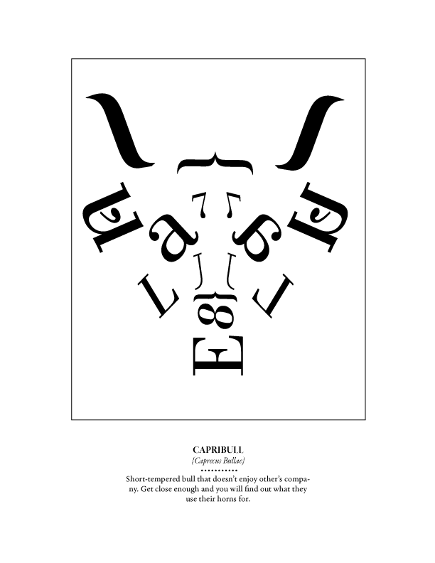 Description: For this artwork, I played and moved around letters from a font-family to create an imaginary animal. For this artwork, I wanted to recreate the face of a bull.