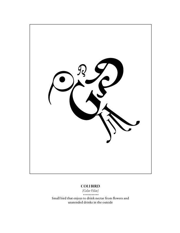 Description: For this artwork, I played and moved around letters from a font-family to create an imaginary animal. The animal I took inspiration for was a humming-bird as it fitted well with the font style I was using.