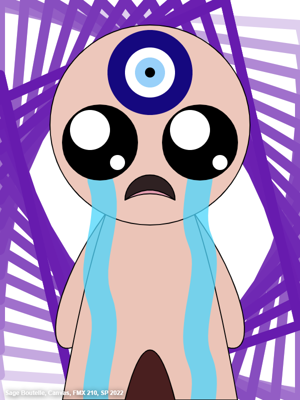 DESCRIPTION: This project was the first time I worked with Dreamweaver, or coding anything for that matter. As per the assignment, the final product was a still image created through code. The image is based on the character Isaac from the video game series Binding of Isaac. To create it, I layered various shapes, some of which use Bézier curves and/or sine waves. The symbol on the forehead is meant to be the “Evil Eye” symbol, a symbol with variations found across multiple cultures.