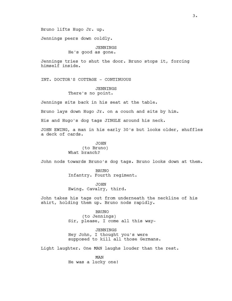 DESCRIPTION: Hugo is, as part of an assignment, a revision of a script written by Libby Welman, one of the other students in my FMX 341 class. The story follows a German soldier in a WWI warzone trying to get to a doctor to help his dying son but the French doctor refuses to help him because their two nationalities were at war. The nuances of Germany’s role in WWI and the ethical conversations about depicting a German WWI soldier in a sympathetic light were beyond the scope of this revision.