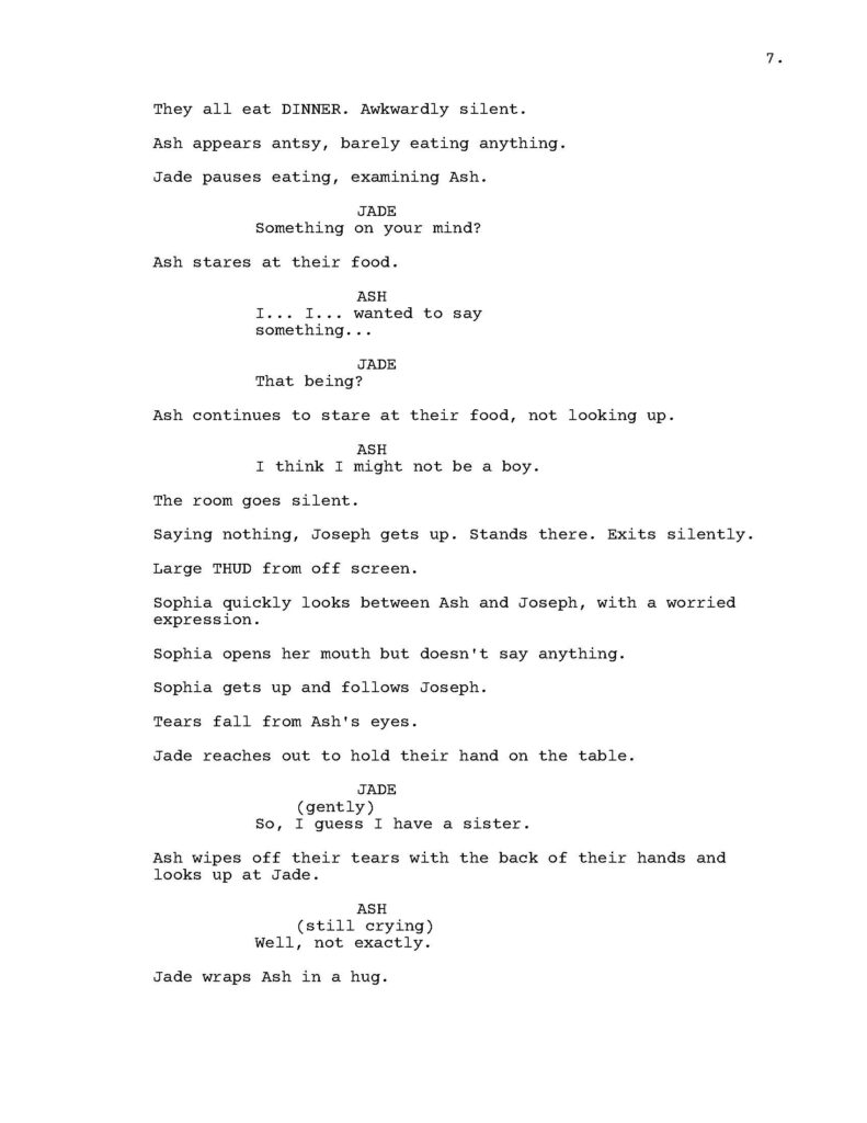 DESCRIPTION: Memories of a Home was the first proper script I made in college. I wrote and revised this script over the course of a semester. The script deals with a non-binary character named Amber who is incredibly socially isolated, depressed, and unsure in their identity. They explore an abandoned home which shows visions of previous queer people who used to live there, which leads to Amber to come to terms with themself and their identity.