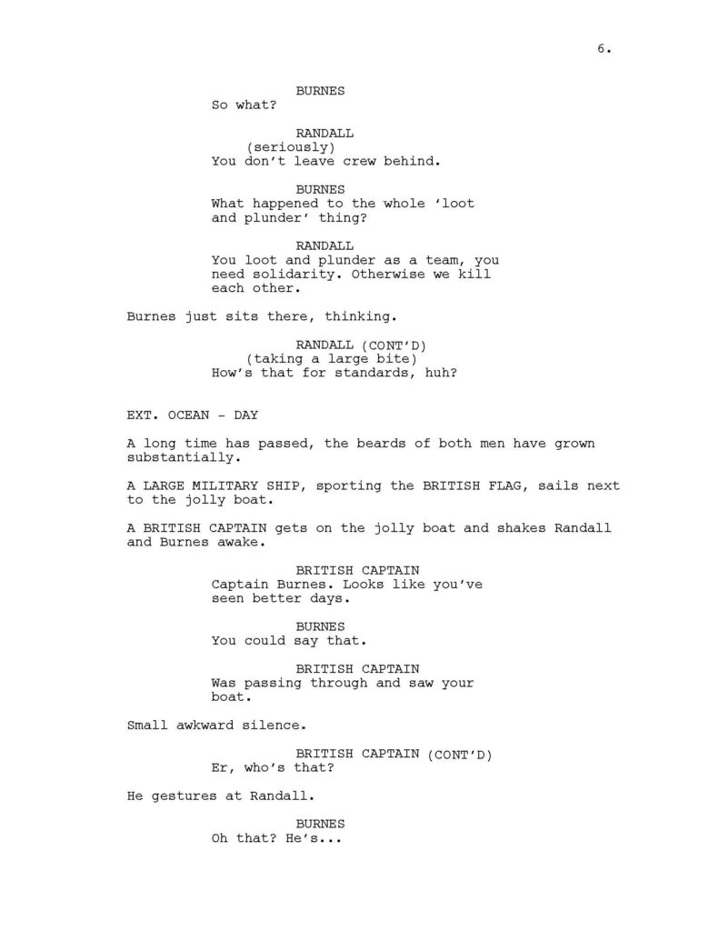 DESCRIPTION: Pirates of Varying Legality is a short film script about a privateer who is lost at sea with his pirate prisoner after a storm killed the rest of the crew. The two grow to like one another and accept that what they do is not so different, since a privateer is basically just a pirate with state sponsorship. I did have to take some creative liberties with actually how principled privateers are, admittedly.