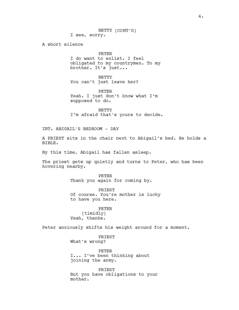 DESCRIPTION: Yours to Decide follows the story of a 1940s man who is forced to choose between taking care of his dying mother or fighting fascists in a war he believes in. This is directly influenced from an anecdote by Jean-Paul Sartre, whose philosophy has greatly influenced how I think. The script ends right before actually making a decision. The point I tried to make was that there is no truly right decision until a choice is made, which is very in line with existentialist world views like that of Sartre’s.
