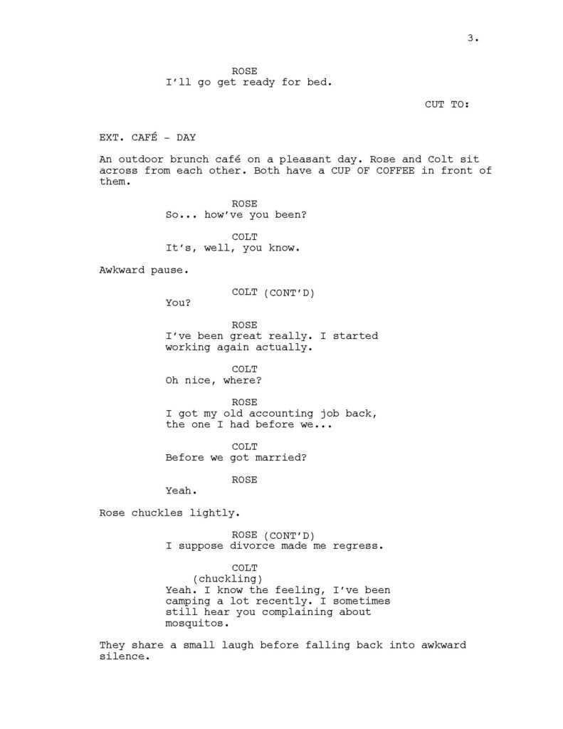 DESCRIPTION: Two Dinners is an adaptation of Grace Paley’s short story “Wants.” It follows two people having two meals together, once while they were married in a dead relationship, and once later in life after they got divorced. Thematically, it focuses on the character Rose who was very held back and suppressed while in the marriage and is able to become a fuller satisfied person on her own terms.