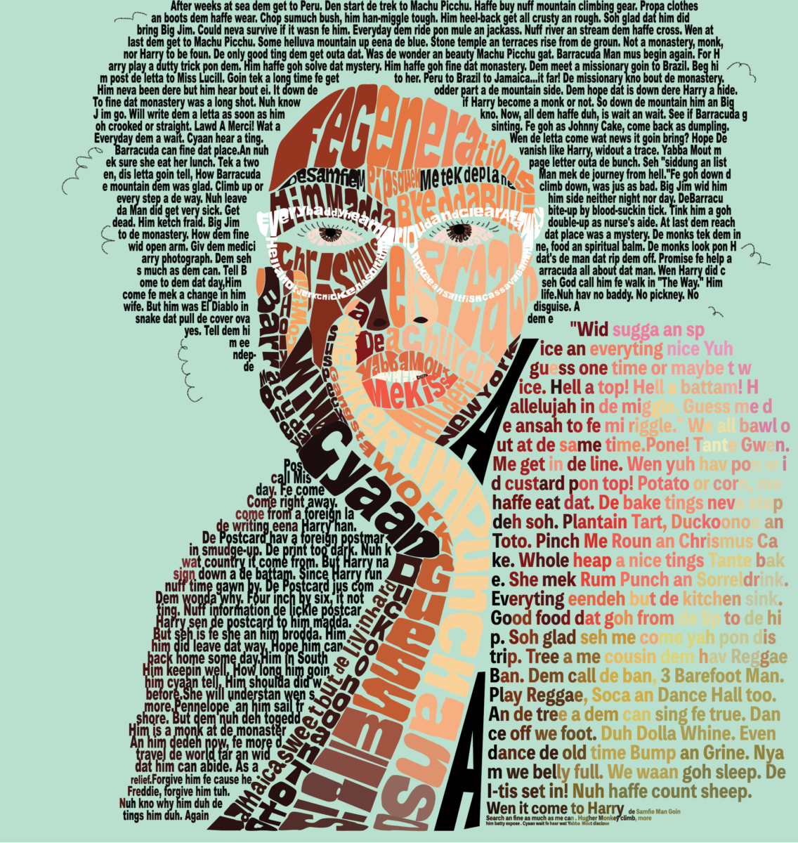 DESCRIPTION: The calligram assignment by far was my favorite piece to make and display. Vectorizing the letters and shaping it myself was a tedious but educational process for me and helped me learn a lot about Illustrator. It also holds meaning to me since the words I used are from my grandmother’s book that I helped her edit.