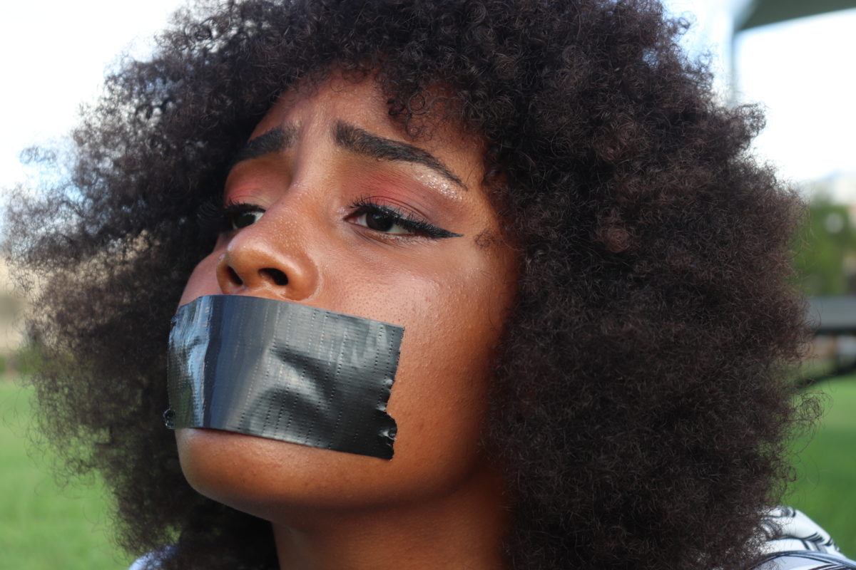DESCRIPTION: This one was definitely a weird start to go to the middle of campus and take a photo of myself with duct tape over my mouth; however, I really love what this piece came to represent and visualize. Once the idea came to me, I knew what I wanted to capture with my camera for this project. The words play against the United States anthem and the irony in the speech.