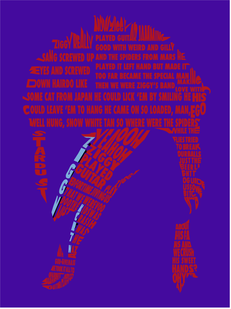 DESCRIPTION: A calligram of David Bowie as Ziggy Stardust.