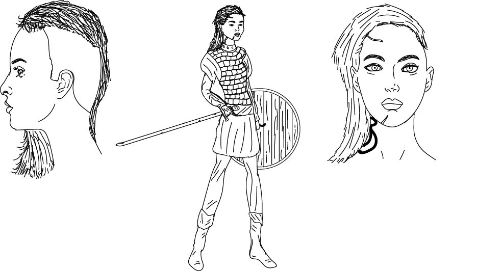 DESCRIPTION: This was a drawing of a Norse woman using only the paintbrush tool. I was tasked with doing a full body pose and two head shots; one front view and the other side view. I also traced an outline for this character before applying details.