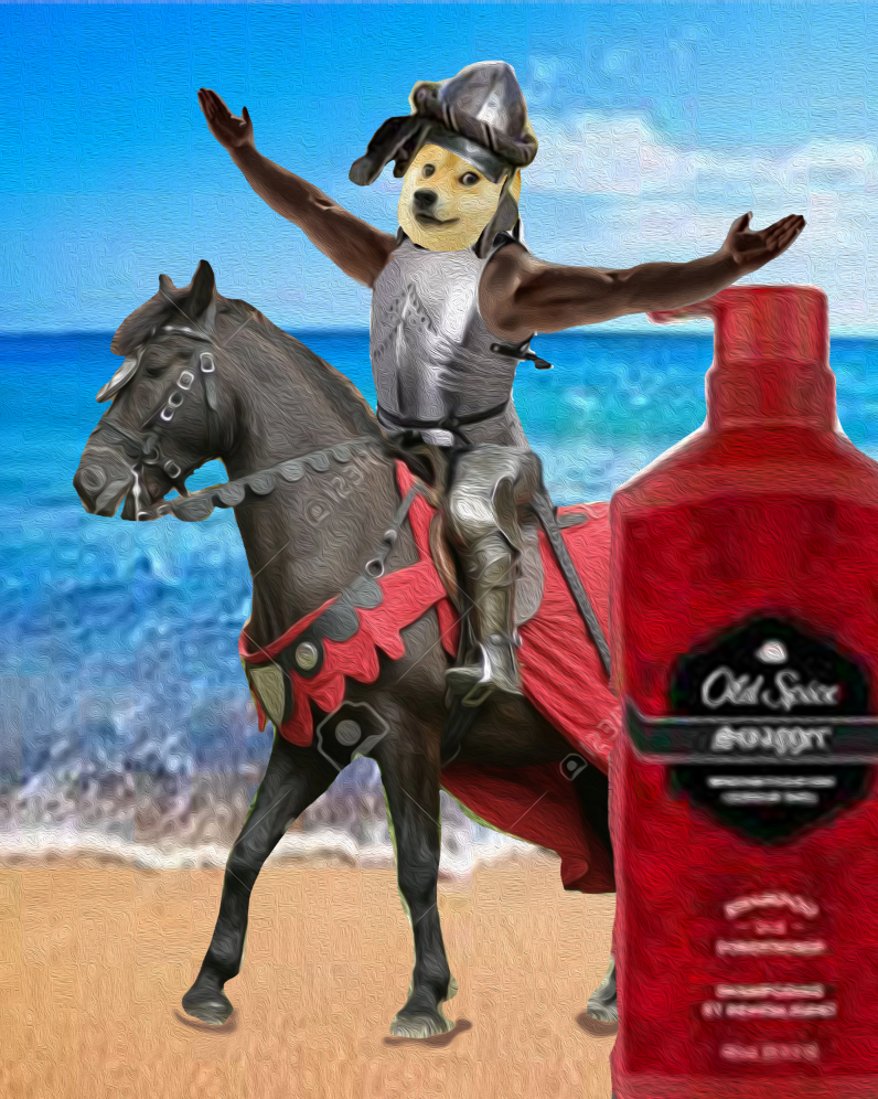 DESCRIPTION: This was my first Photoshop assignment where I made an oil painting of Dodge, the dog meme, riding on a horse in a suit of medieval armor advertising Old Spice.