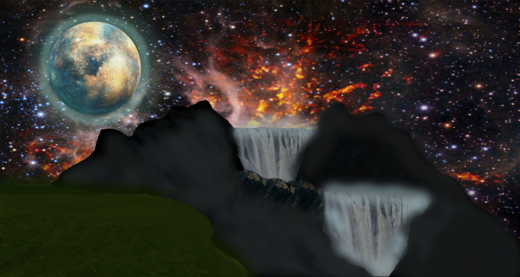 DESCRIPTION: This was my third Photoshop assignment where I created a floating waterfall in space with mountains in the background.