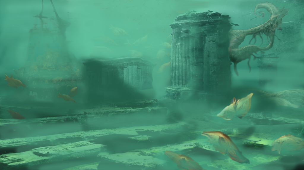 DESCRIPTION: This was my fourth Photoshop assignment where I used previously ai generated pictures through Midjourney to create an underwater city that had a sea monster, and a pirate ship in the scene.