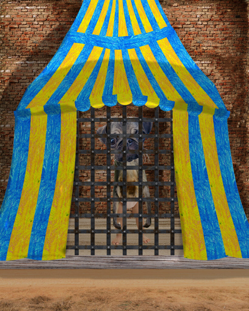 DESCRIPTION: This project was to make the Puppy Monkey Baby from an old Super Bowel add. We had to then put in an environment that we figured it would be in if it was real. I took a dark approach to this and figured that if something this uniquely strange existed it would probably be put into a circus and someone would profit off of people viewing it in a cage.