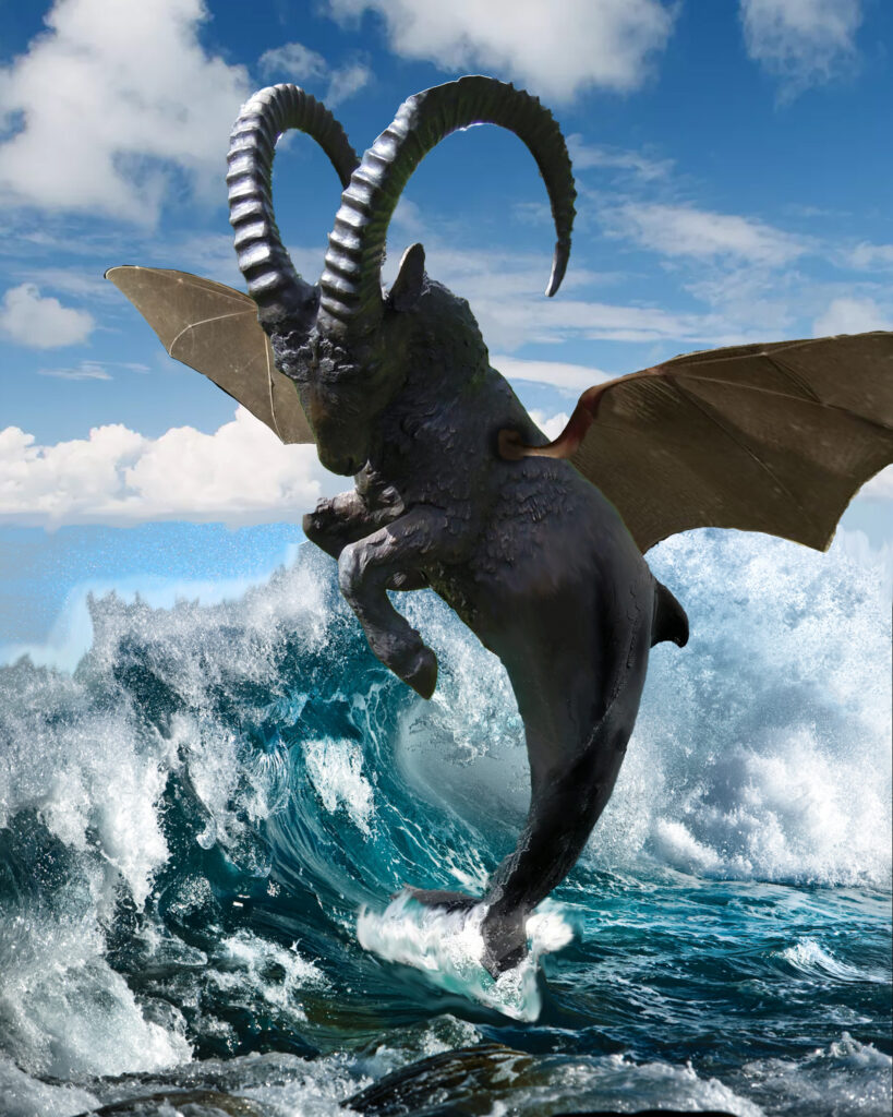 DESCRIPTION: I photoshopped a dolphin, a goat, and a bat together, in front of an ocean, to create a unique obscene creature but had some believability.